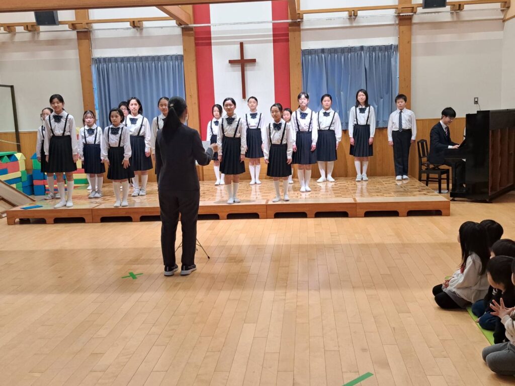 広面小学校の音楽部のみなさんが来園し、素敵なコンサートを開いてくださいました。子どもたちがよく知っている曲をたくさん披露してくださり、会場は大盛り上がり!手拍子をしたり、一緒に口ずさんだりと、笑顔溢れる時間となりました。美しい歌声と息の合った振り付けに、子どもたちはうっとり。音楽の楽しさを全身で感じることができました。また、音楽部員の中に卒園児の姿もあり、立派に成長した様子を見ることができ、職員一同とても嬉しく思いました。音楽部の皆さん、素敵な時間をありがとうございました。